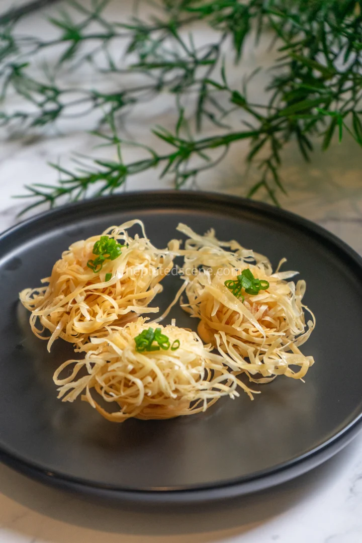• Spring roll skin – These thin, delicate wrappers create the signature “spiky” coating when shredded into strips. Look for fresh spring roll wrappers in the refrigerated section – they should be pliable and not dried out or cracked.